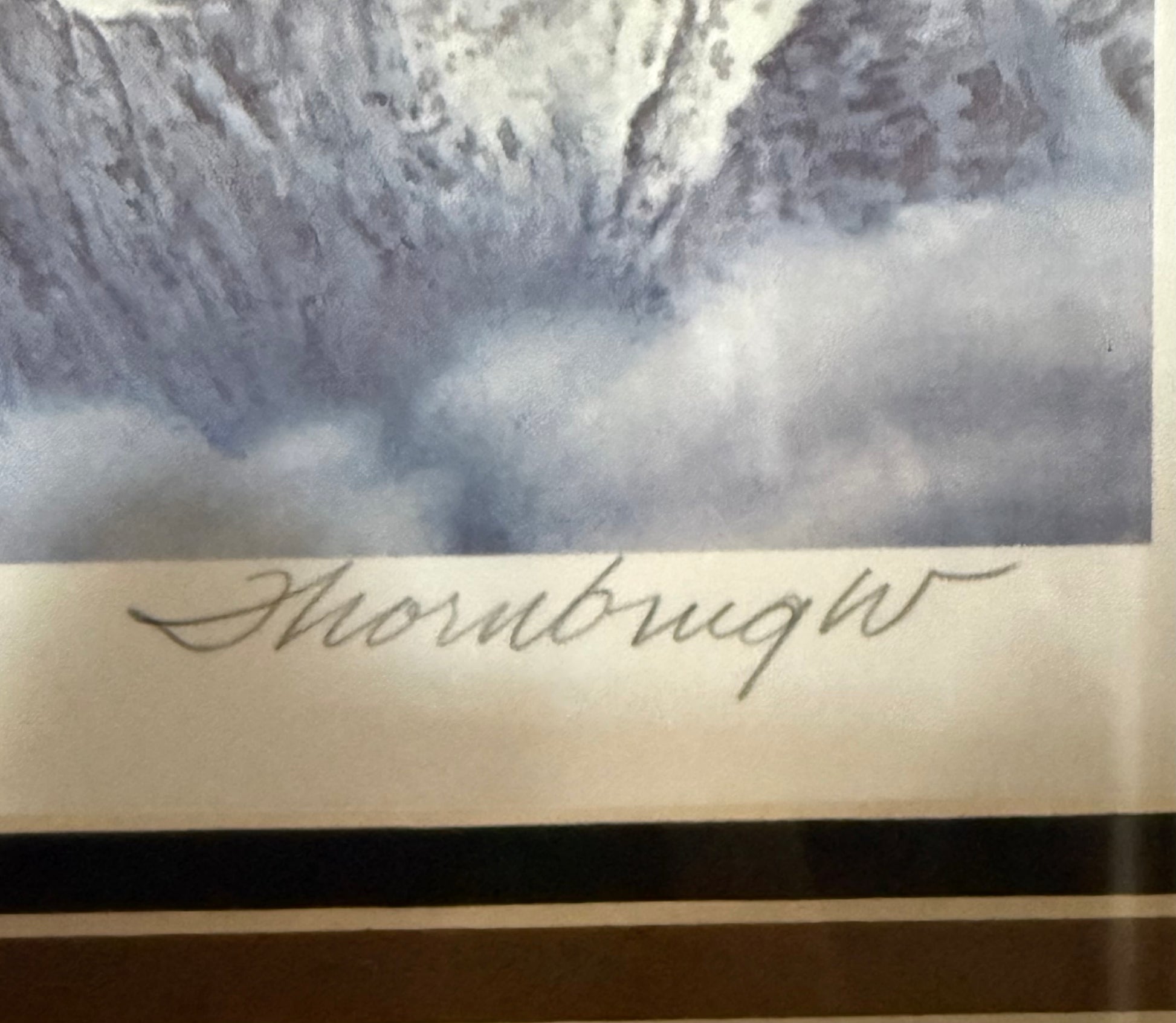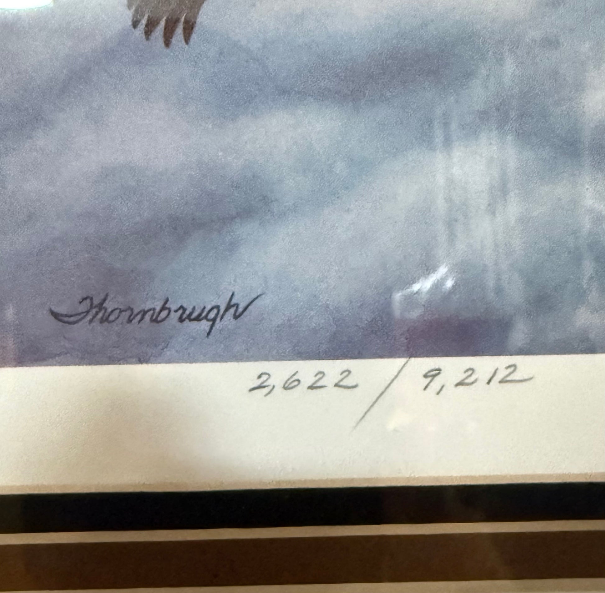 Original 1986 First Montana Waterfowl Stamp Print, hand pencil-signed and numbered 2,622/9,212 by wildlife artist William “Bill” Thornbrough. Features Canada geese in flight over a mountain landscape and includes the original Montana waterfowl stamp professionally mounted beneath the artwork. Double-matted and framed. A desirable early state conservation print sought after by waterfowl, stamp, and wildlife art collectors.