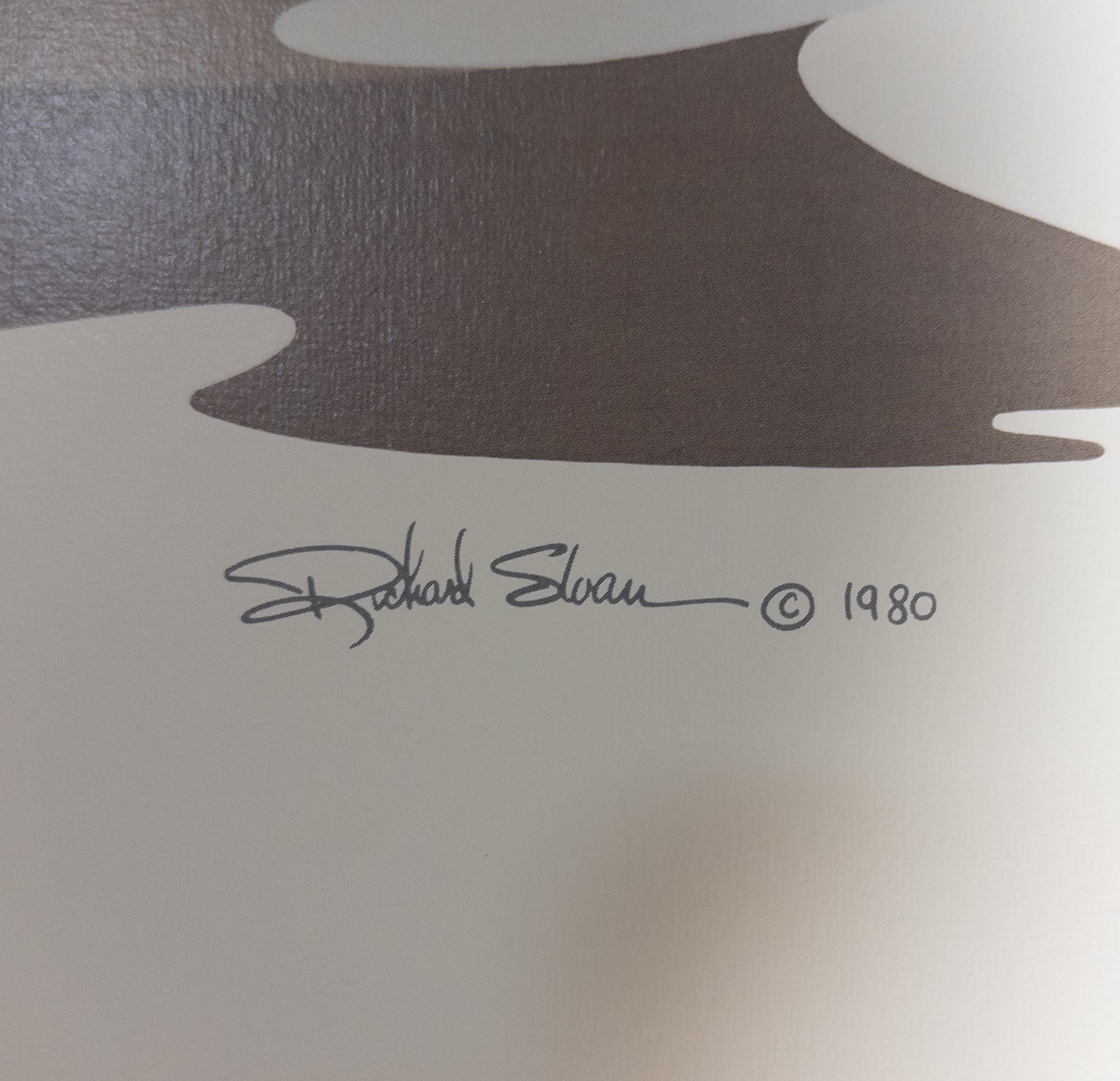 A beautiful vintage wildlife art print by Richard Sloan, dated 1980, featuring a graceful pair of Canada geese gliding across calm water. This soft, realistic composition is a timeless piece of sporting and lodge-style wall décor.